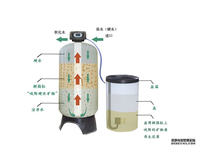 1、供水:未處理的硬水通過樹脂層,發(fā)生交換反應,產(chǎn)生軟化水。