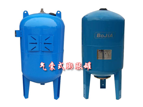 氣囊式膨脹罐,用于系統(tǒng)中起緩沖壓力波動(dòng)及部分給水的作用,在熱力系統(tǒng)中主要是用來(lái)吸收工作介質(zhì)因溫度變化增加的那部分體積;在供水系統(tǒng)中主要用來(lái)吸收系統(tǒng)因閥門、水泵等開(kāi)和關(guān)所引起的水錘沖擊,以及夜間少量補(bǔ)水使供水系統(tǒng)主泵休眠從而減少用電,延長(zhǎng)水泵使用壽命。膨脹罐—由罐體、氣囊、進(jìn)/出水口及補(bǔ)氣口四部份組成。罐體一般為碳鋼材質(zhì),外面是防銹烤漆層;氣囊為EPDM環(huán)保橡膠;氣囊與罐體之間的預(yù)充氣體出廠時(shí)已充好,無(wú)需自己加氣。